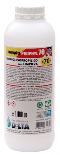 Alcohol isopropílico de limpieza al 70%. Elimina o minimiza la contaminación en superficies por contacto humano.